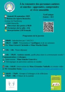 A la rencontre des personnes autistes et sourdes 20 septembre 2025 - 9 h 30 minMARSEILLE Entrée : 10 EUR Pour réserver : ascsourds13@gmail.com