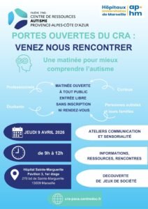 Portes ouvertes du Centre Ressources Autisme 9 avril 2026 - 9 h 00 minMARSEILLEMatinée portes ouvertes au CRA de MARSEILLE